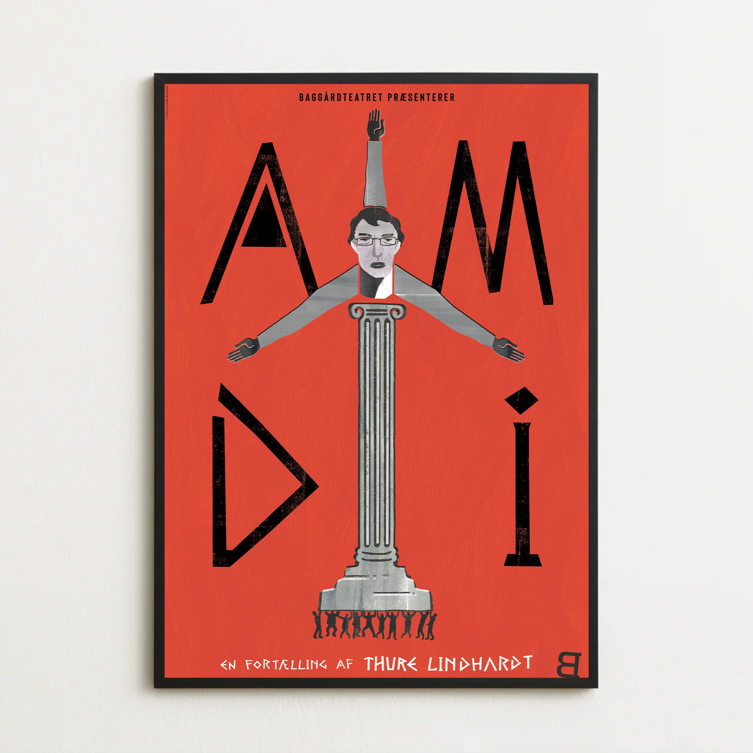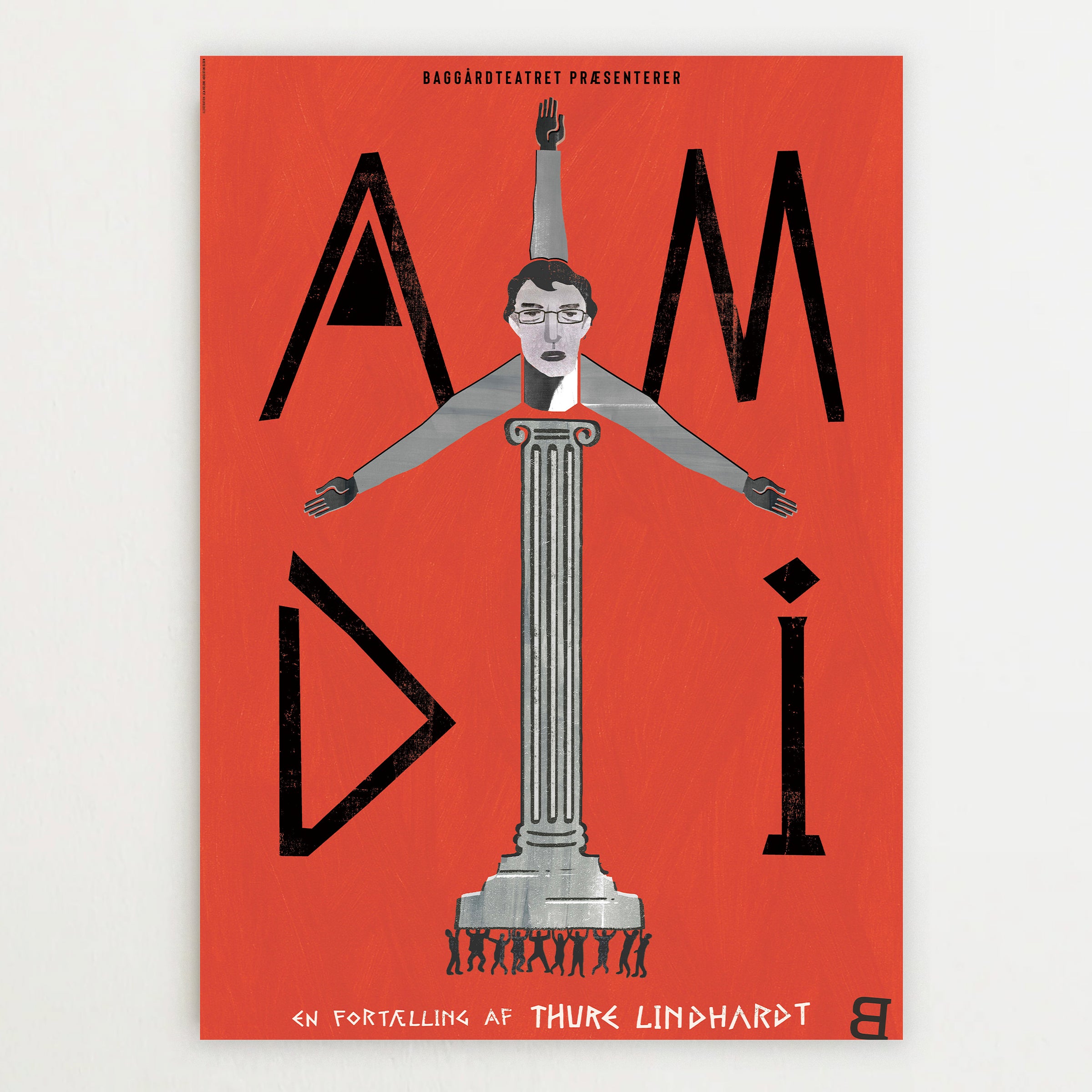 Forestillingsplakat til AMDI - En teaterforestilling af BaggårdTeatret og Thure Lindhardt baseret på bogen Amdi bliver til af Rune Skyum-Nielsen i samarbejde med Thure Lindhardt.